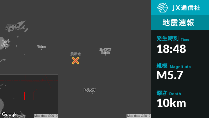 9月04日 18:48頃、トンガのPangaiから西北西220kmの地点でM5.7の地震がありました。