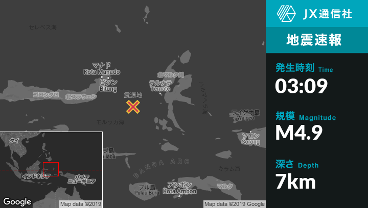 | 震源地 | インドネシアのKota Ternateから西南西141kmの地点 |