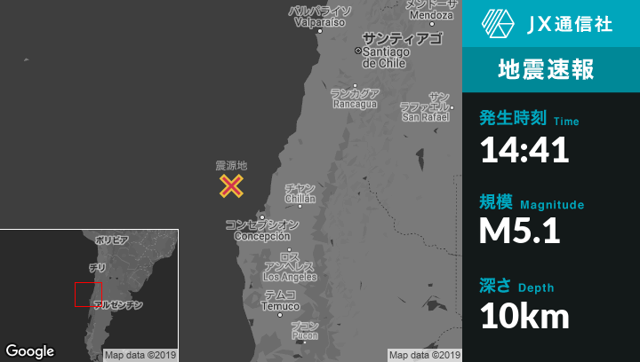 9月05日 14:41頃、チリのTalcahuanoから北西93kmの地点でM5.1の地震がありました。