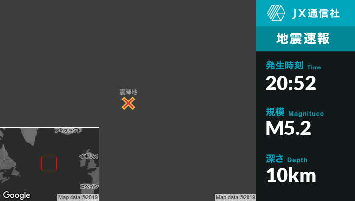 9月05日 20:52頃、グリーンランドのNanortalikから南東1173kmの地点でM5.2の地震がありました。