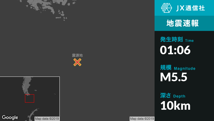 9月06日 01:06頃、アルゼンチンのUshuaiaから南南東333kmの地点でM5.5の地震がありました。