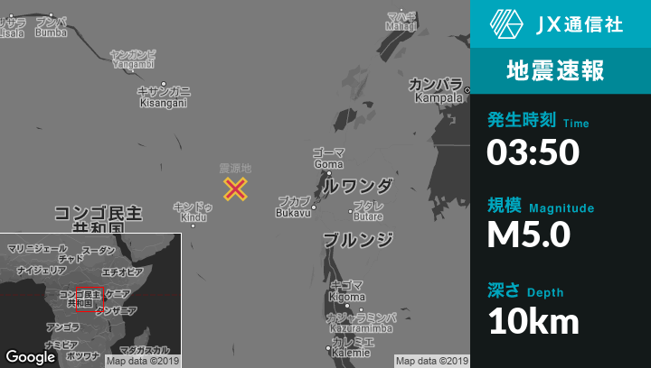 | 震源地 | コンゴ民主共和国のKinduから北東156kmの地点 |