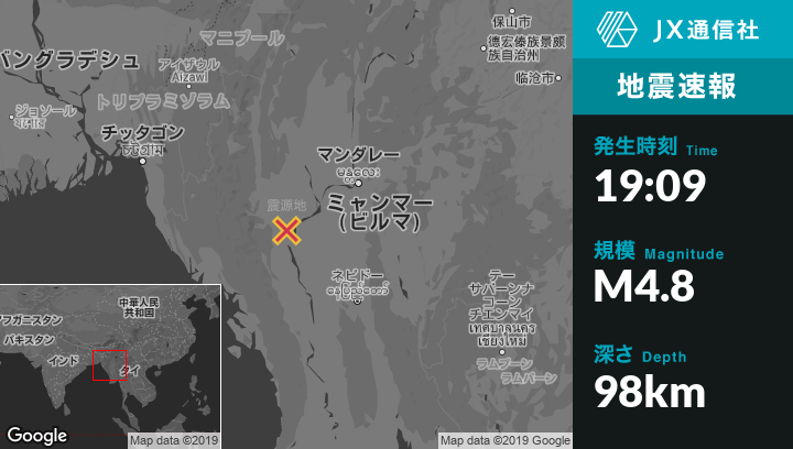 | 震源地 | ミャンマーのChaukから北北西37kmの地点 |