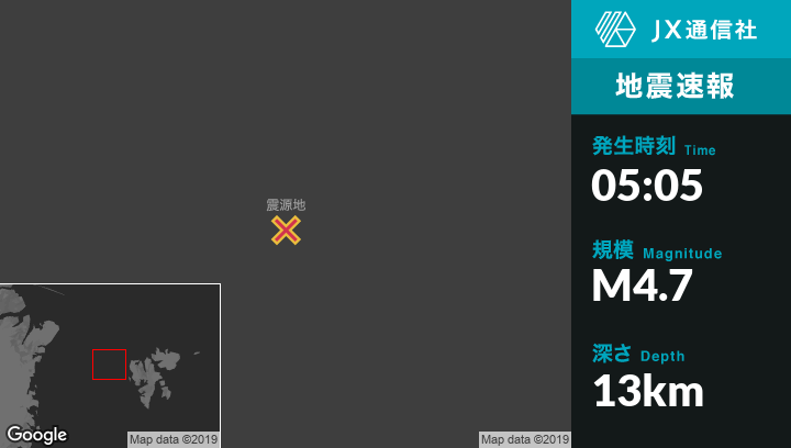 | 震源地 | スバールバル諸島とヤンマイエン島のLongyearbyenから北西278kmの地点 |