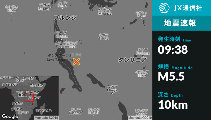 9月09日 09:38頃、タンザニアのMpandaから西南西31kmの地点でM5.5の地震がありました。