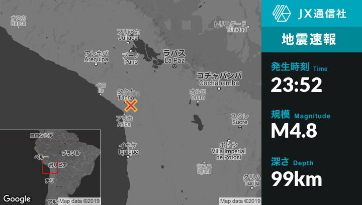 9月11日 23:52頃、ペルーのTacnaから東24kmの地点でM4.8の地震がありました。