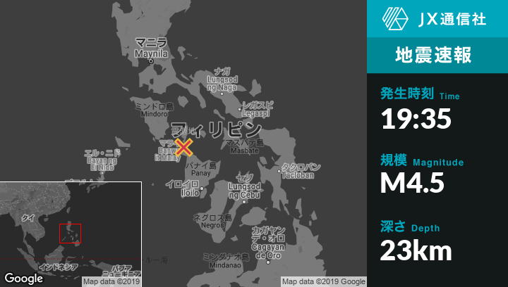 9月14日 19:35頃、フィリピンのSanta Feから南4kmの地点でM4.5の地震がありました。
