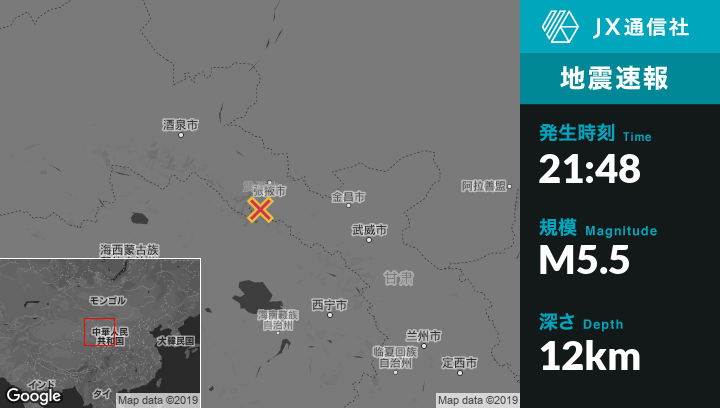 9月16日 21:48頃、中国のZhangyeから南南西45kmの地点でM5.5の地震がありました。