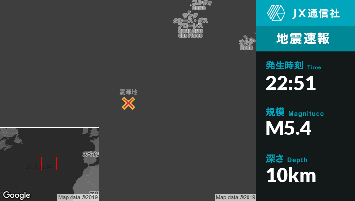 9月17日 22:51頃、ポルトガルのSanta Cruz das Floresから南西424kmの地点でM5.4の地震がありました。