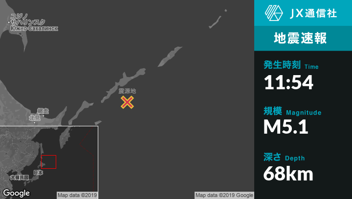 9月18日 11:54頃、ロシアのKuril'skから南77kmの地点でM5.1の地震がありました。