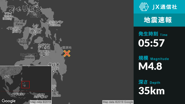 9月26日 05:57頃、フィリピンのAras-asanから東31kmの地点でM4.8の地震がありました。