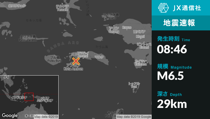 9月26日 08:46頃、インドネシアのKairatuから南南東8kmの地点でM6.5の地震がありました。