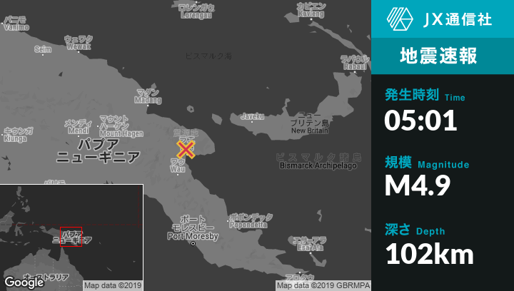 9月29日 05:01頃、パプアニューギニアのLaeから北31kmの地点でM4.9の地震がありました。