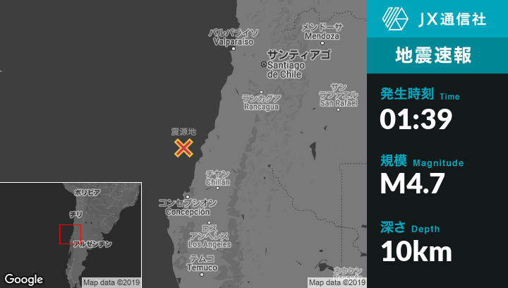 9月30日 01:39頃、チリのConstitucionから西南西70kmの地点でM4.7の地震がありました。