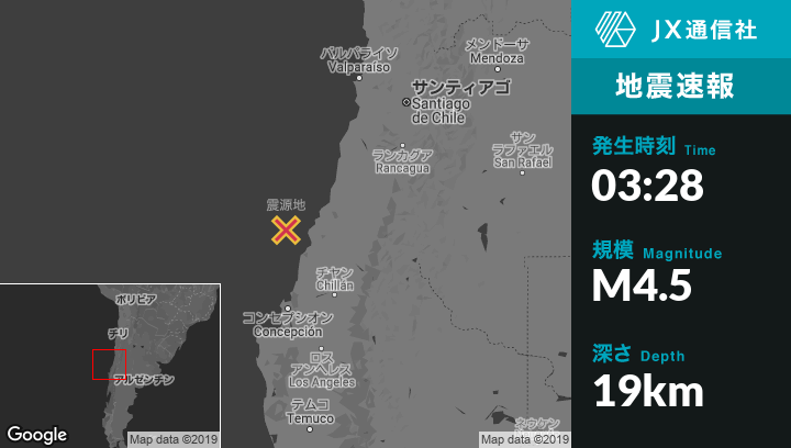 9月30日 03:28頃、チリのConstitucionから西南西62kmの地点でM4.5の地震がありました。