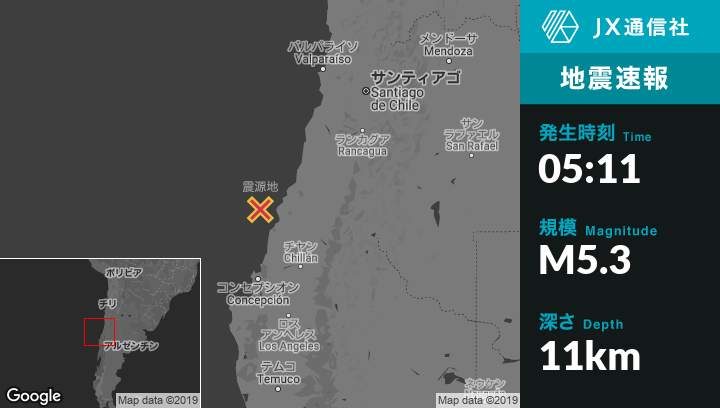 9月30日 05:11頃、チリのConstitucionから西南西54kmの地点でM5.3の地震がありました。