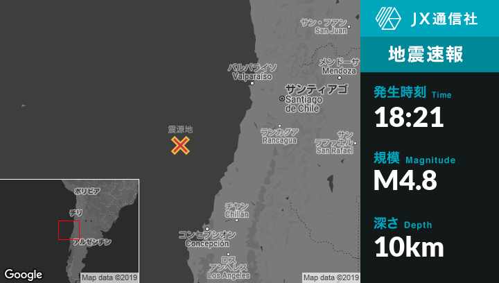 9月30日 18:21頃、チリのConstitucionから西北西158kmの地点でM4.8の地震がありました。