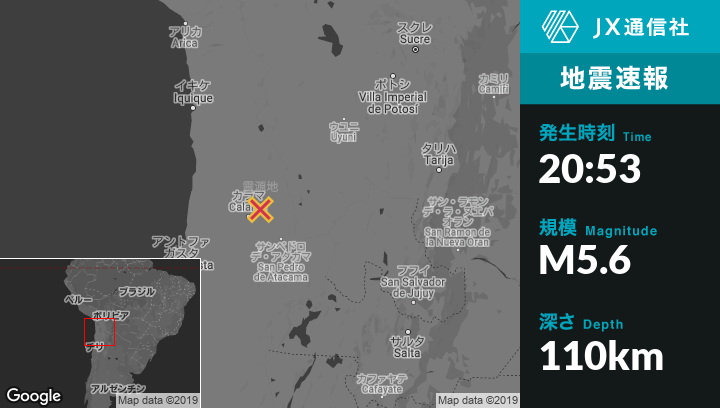 9月30日 20:53頃、チリのCalamaから北東40kmの地点でM5.6の地震がありました。