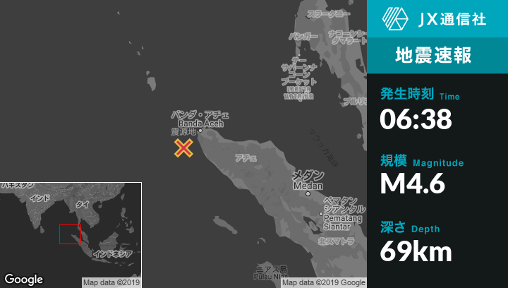 10月03日 06:38頃、インドネシアのBanda Acehから南西76kmの地点でM4.6の地震がありました。