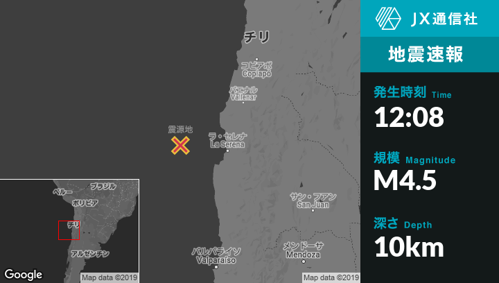 10月04日 12:08頃、チリのCoquimboから西北西141kmの地点でM4.5の地震がありました。