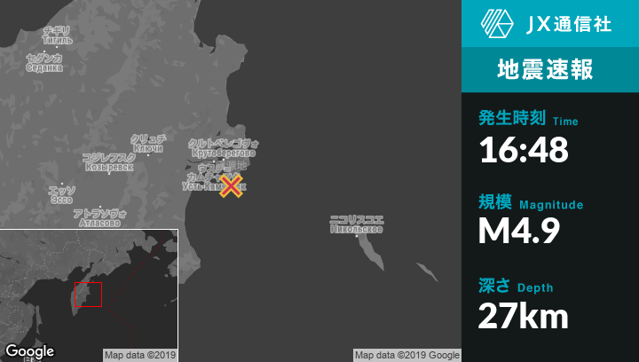10月11日 16:48頃、ロシアのUst'-Kamchatsk Staryyから南東39kmの地点でM4.9の地震がありました。