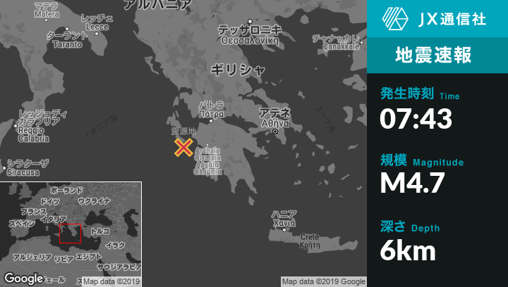 10月12日 07:43頃、ギリシャのLithakiaから南東5kmの地点でM4.7の地震がありました。