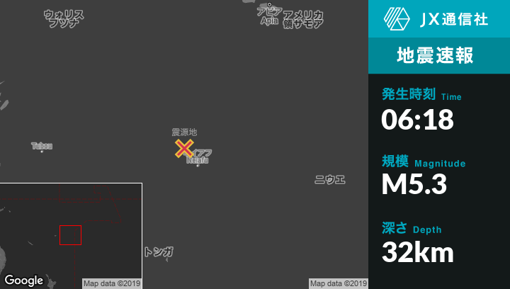 10月19日 06:18頃、トンガのNeiafuから北北西82kmの地点でM5.3の地震がありました。