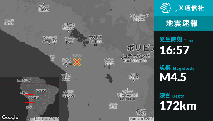 10月19日 16:57頃、ペルーのTarataから東南東58kmの地点でM4.5の地震がありました。