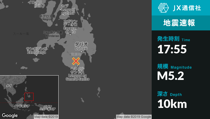 10月20日 17:55頃、フィリピンのLambayongから北7kmの地点でM5.2の地震がありました。