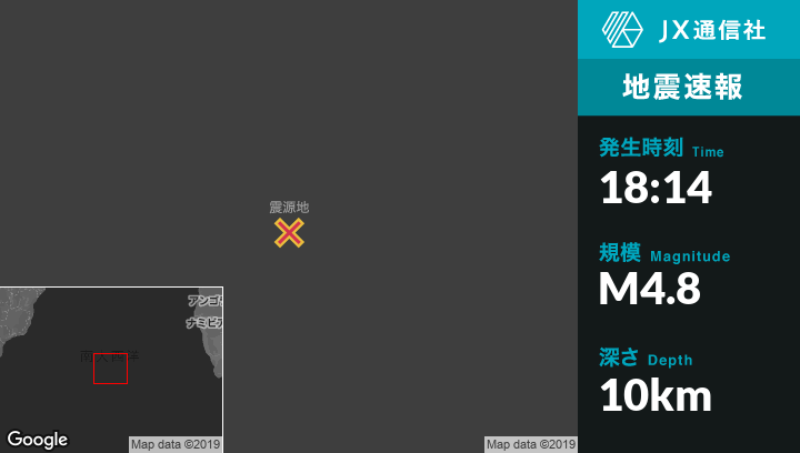 10月20日 18:14頃、セントヘレナのEdinburgh of the Seven Seasから北北西526kmの地点でM4.8の地震がありました。