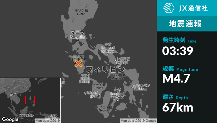 10月21日 03:39頃、フィリピンのAuroraから南南西18kmの地点でM4.7の地震がありました。