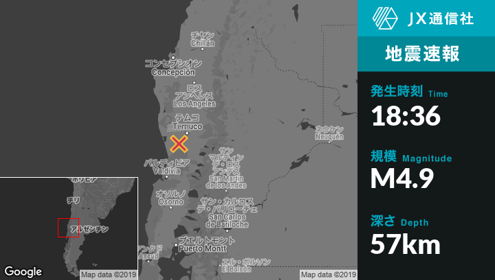 10月21日 18:36頃、チリのPitrufquenから西北西19kmの地点でM4.9の地震がありました。