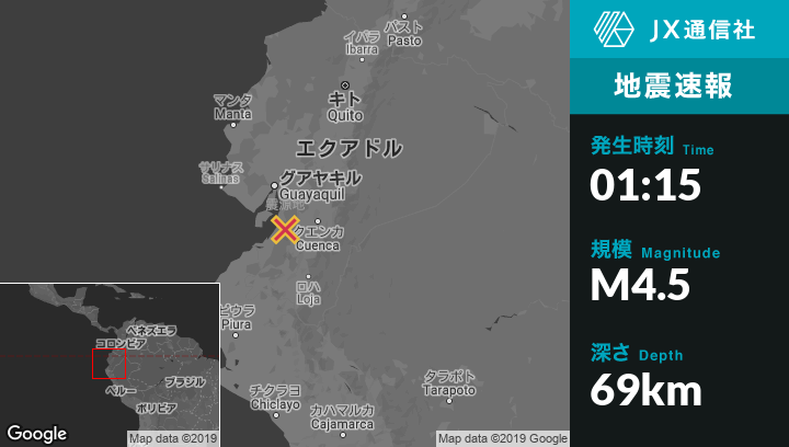 10月23日 01:15頃、エクアドルのBalaoから東15kmの地点でM4.5の地震がありました。