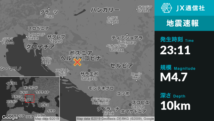 | 震源地 | ボスニア・ヘルツェゴビナのTurbeから北15kmの地点 |