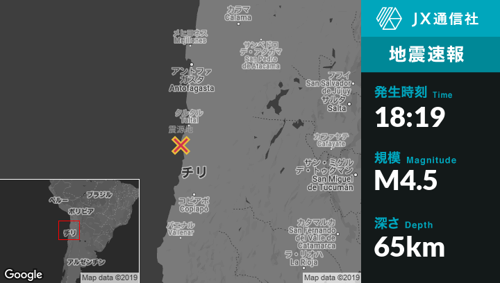 11月04日 18:19頃、チリのTaltalから南南西57kmの地点でM4.5の地震がありました。