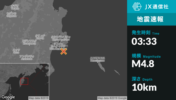 11月06日 03:33頃、ロシアのUst'-Kamchatsk Staryyから南東54kmの地点でM4.8の地震がありました。