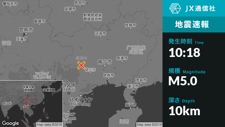 | 震源地 | 中国のXinjingから南東43kmの地点 |