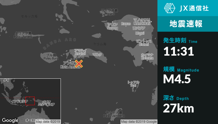 11月25日 11:31頃、インドネシアのSaparuaから南東27kmの地点でM4.5の地震がありました。