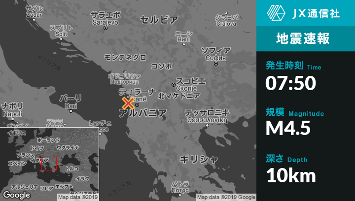 | 震源地 | アルバニアのDurresから北16kmの地点 |