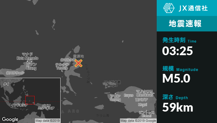 | 震源地 | インドネシアのTobeloから東南東68kmの地点 |
