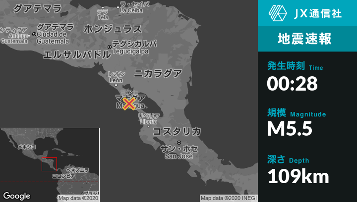 | 震源地 | ニカラグアのSanta Teresaから西9kmの地点 |