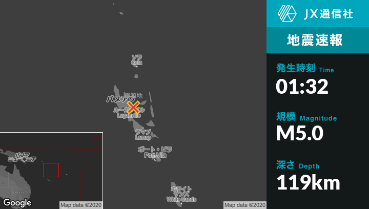 | 震源地 | バヌアツのLuganvilleから東北東26kmの地点 |