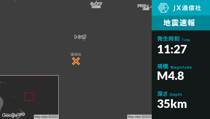 | 震源地 | トンガの`Ohonuaから南南西166kmの地点 |