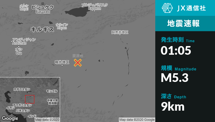 1月18日 01:05頃、中国のArzakから東88kmの地点でM5.3の地震がありました。