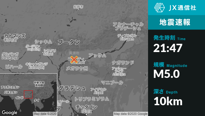 | 震源地 | インドのAbhayapuriから東16kmの地点 |