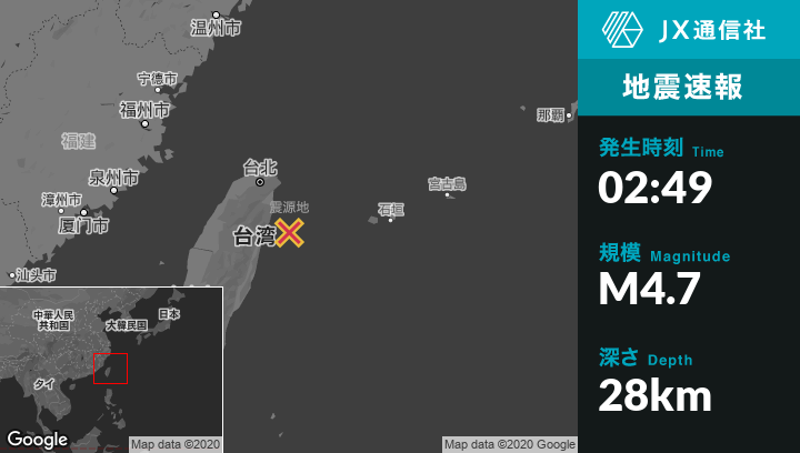 2月14日 02:49頃、台湾のSu'aoから南東50kmの地点でM4.7の地震がありました。