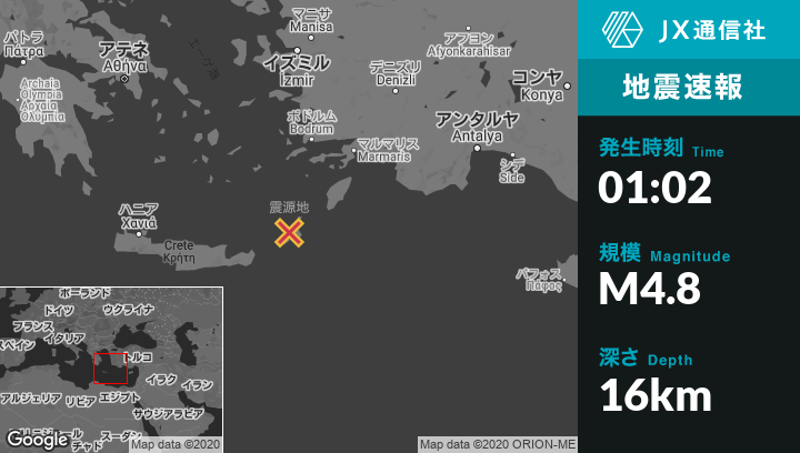 2月15日 01:02頃、ギリシャのKarpathosから北西25kmの地点でM4.8の地震がありました。