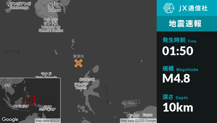 | 震源地 | インドネシアのTobeloから北西157kmの地点 |