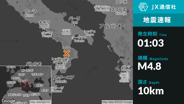 2月25日 01:03頃、イタリアのRendeから北2kmの地点でM4.8の地震がありました。