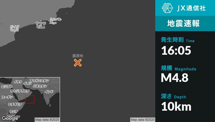 3月20日 16:05頃、イエメンのTamridaから東北東345kmの地点でM4.8の地震がありました。